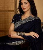 Navy Blue Silk Blend Chiffon Embroidered Saree With Unstitched Blouse