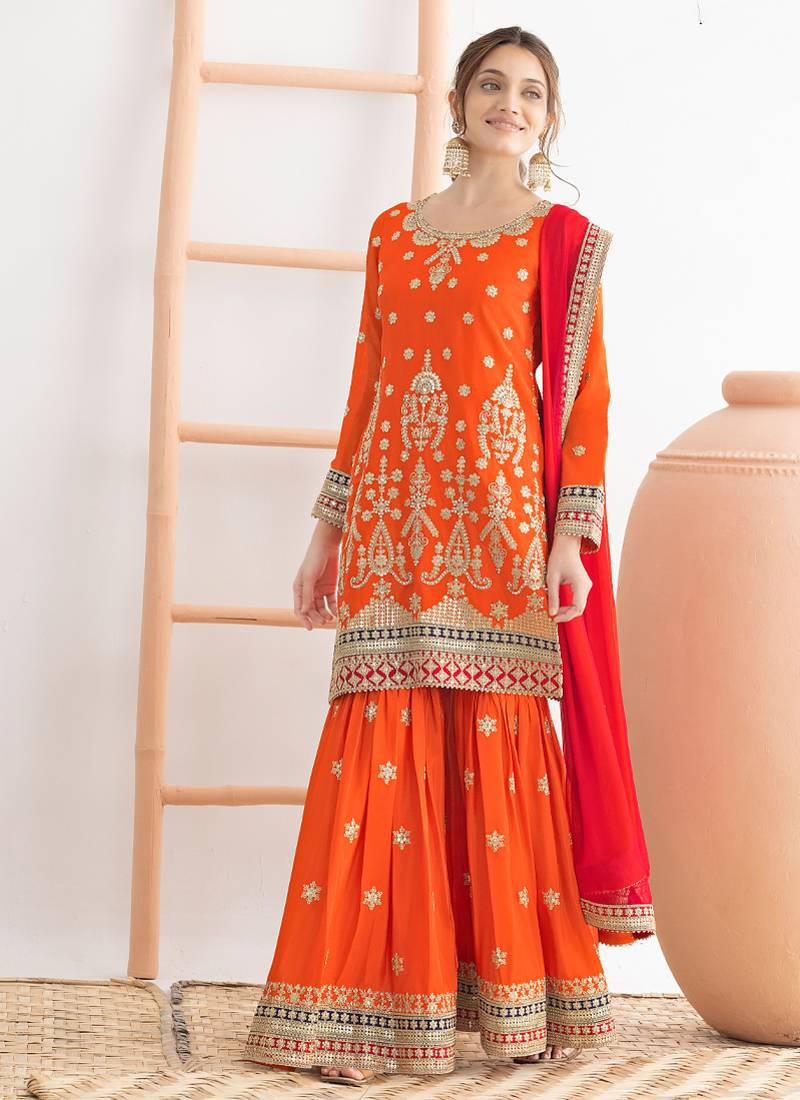 Orange Chinon Sharara Suit For Women Festival Wear Semi stitched