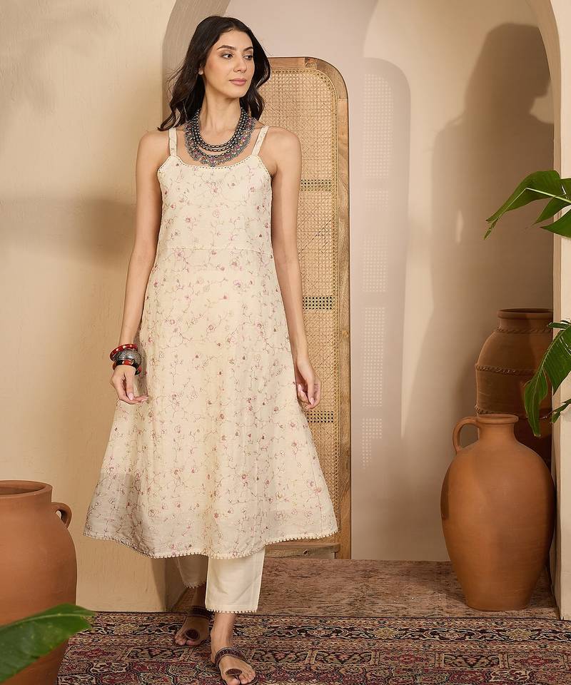 Beige Khadi Silk Embroidered Embroidery Work Top Bottom Set