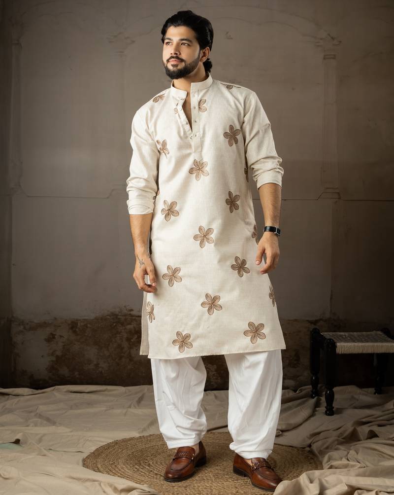 Beige Color Linen Fabric Designer Embroidered Festive Special Kurta For Men