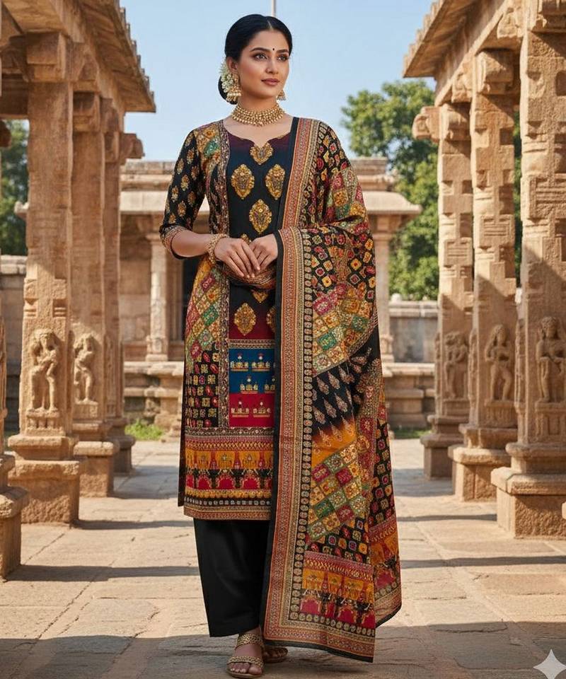 Black Chinon Printed Ethnic Ceremonial Suit Unstitched