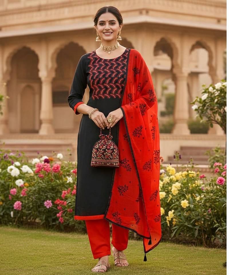 • Product Id : 4717387 • Package Details : 1 Top/1 Bottom/1 Dupatta • Type : Kurta Sets • Work : Embroidered • Type : Resham Embroidery • Look : Designer • Sleeve : Half Sleeve • Neck Style : Round Neck • Stitching : Unstitched • Fabric : Chanderi • Color : Black Stitching [+]