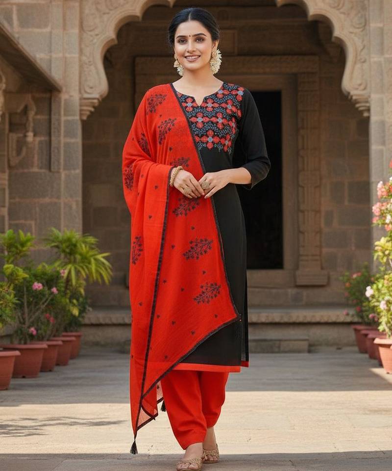 Black Color Cotton Slub Fabric Designer Casual Suit With Embroidery Unstitched