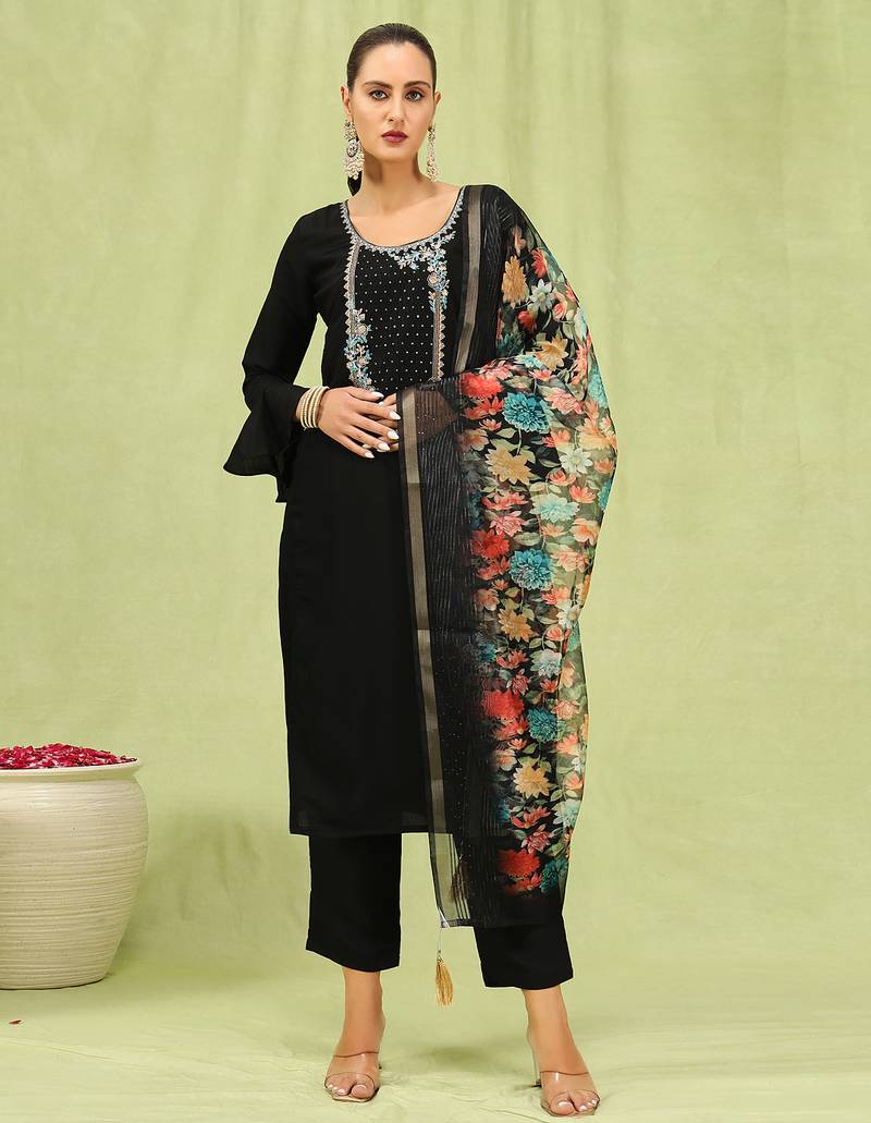 Black Color Viscose Roman Silk Fabric Designer Embroidery Work Sophisticated Girlie Salwar Kameez