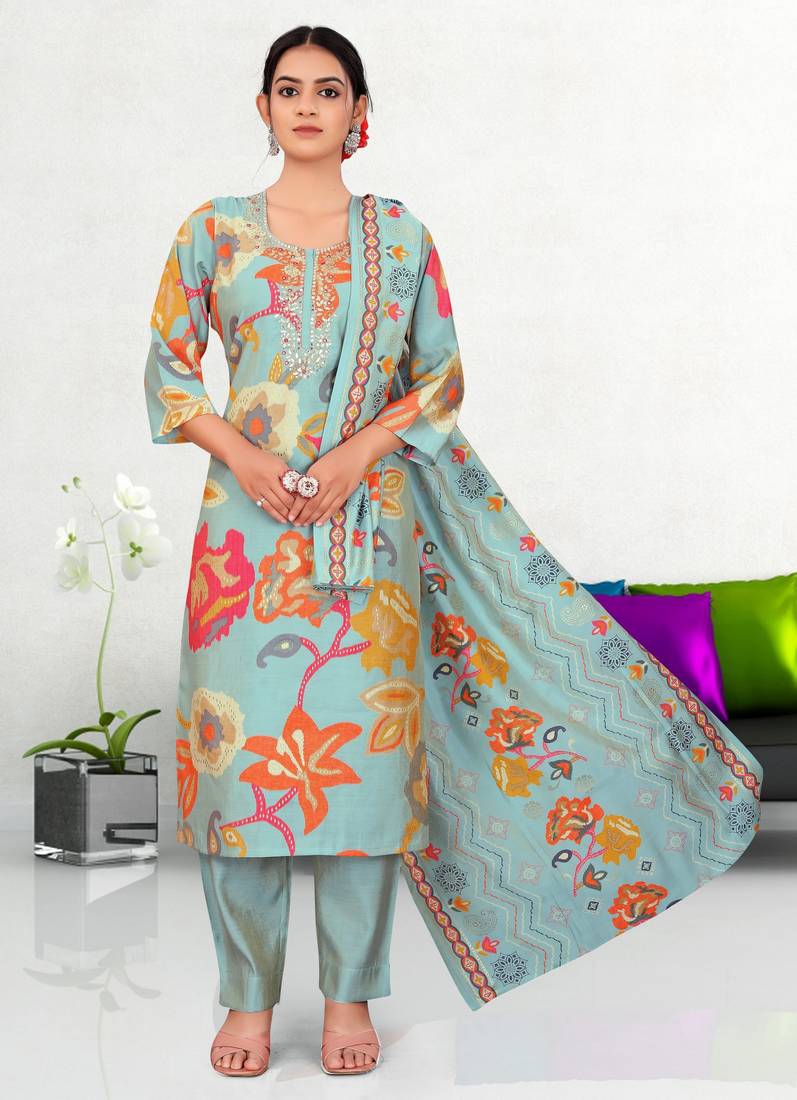 • Product Id : 4674355 • Package Details : 1 Kurta/1 Bottom/1 Dupatta • Type : Kurta Sets • Occasion : Casual • Fabric : Art Silk • Work : Embroidered • Type : Abstract Print • Look : Designer • Sleeve : Half Sleeve • Neck Style : Round Neck • Color : Blue • Stitching : Stitched • Length : 40.0 • Side Slit : Yes Payments [+]