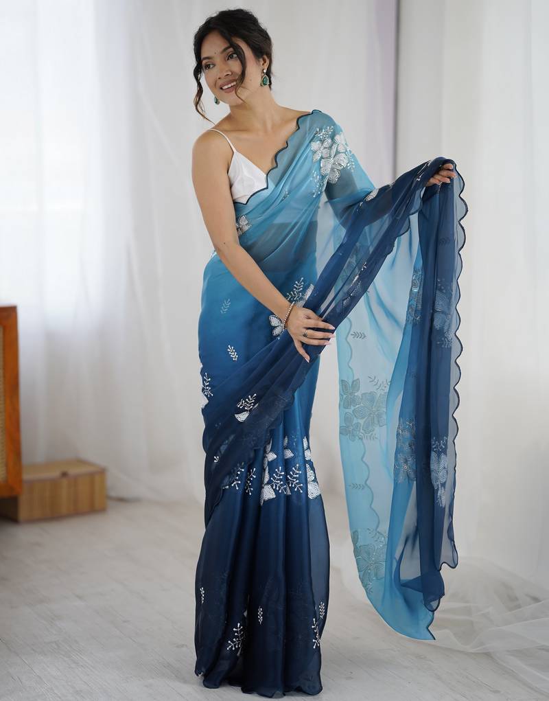 Blue Color Glamorous Jimmy Choo Fabric Beautiful Embroidered Saree