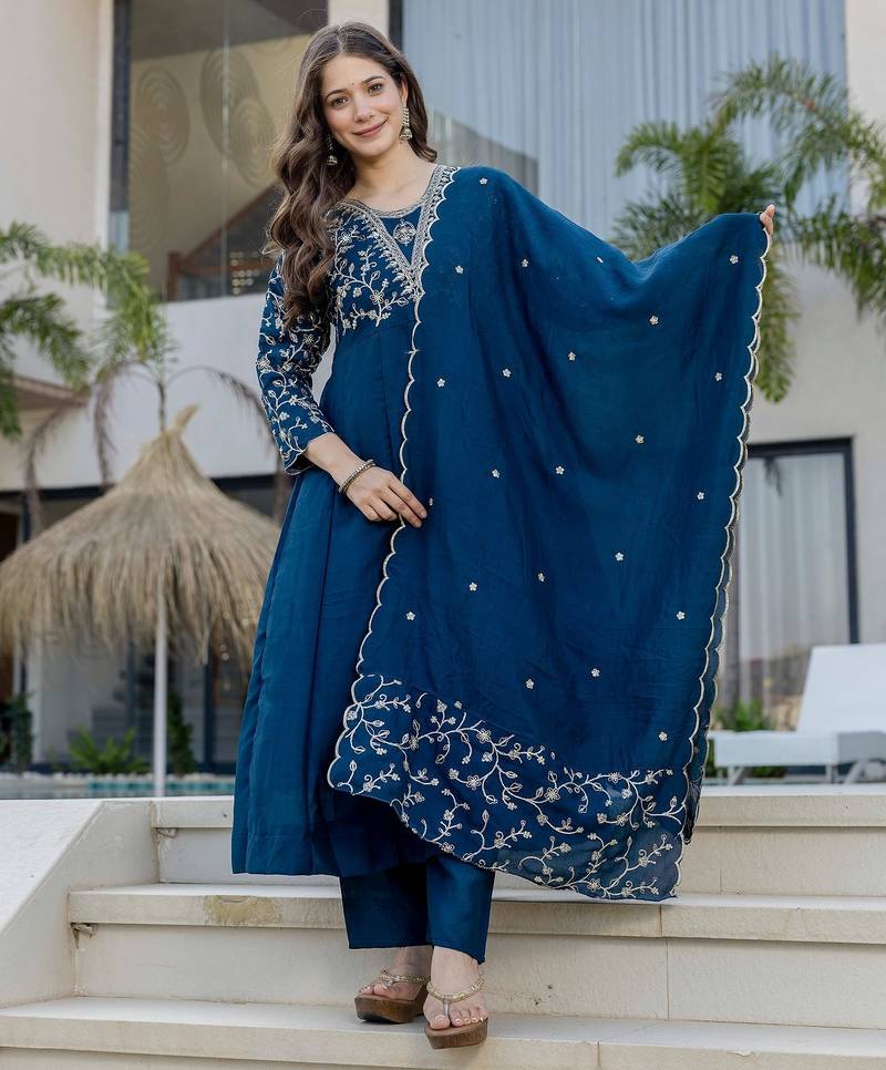 • Product Id : 4702023 • Package Details : 1 Kurta/1 Bottom/1 Dupatta • Type : Kurta Sets • Occasion : Casual • Fabric : Art Silk • Work : Embroidered • Type : Resham Embroidery • Look : Contemporary • Sleeve : Half Sleeve • Neck Style : Asymmetrical Neck Kameez • Color : Blue • Stitching : Stitched • Length : 40.0 • Side Slit : Yes Payments [+]