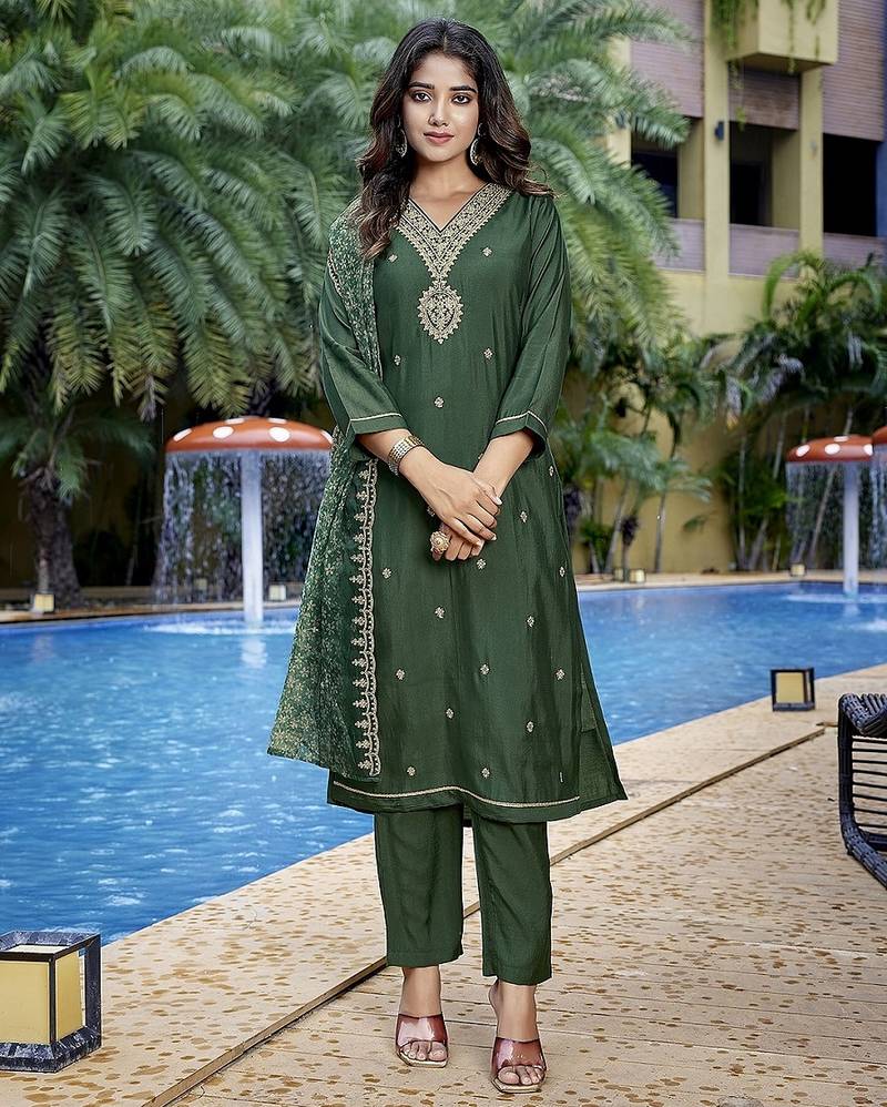 Bottle Green Color Stylish Partywear Readymade Ethnic Suit