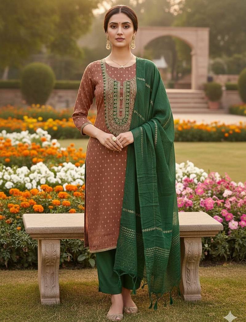 Brown Shimmer Jacquard Ethnic Readymade Suit Unstitched