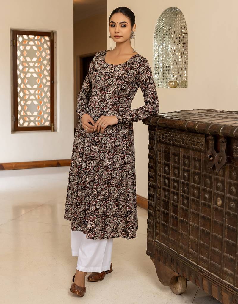 Brown Color Cotton Fabric Designer Printed Stylish Long Kurti