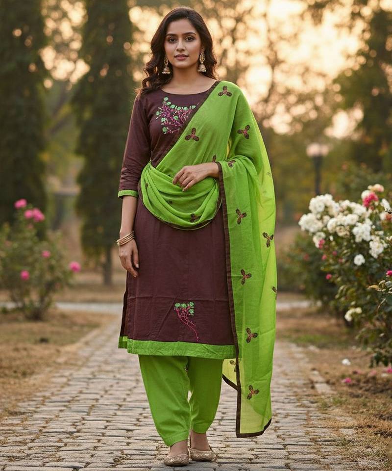 Brown Color Cotton Slub Fabric Designer Casual Suit With Embroidery Unstitched