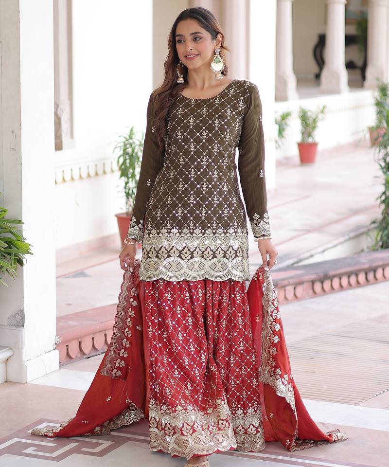 Brown Color Vichitra Silk Fabric Classy Sequins Embroidered Partywear Readymade Suit With Dupatta