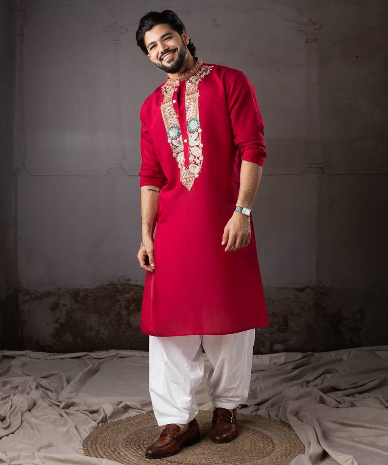 • Product Id : 4717295 • Package Details : 1 Kurta/1 Payjama • Type : Kurta Pajama • Occasion : Ceremonial • Fabric : Art Silk • Work : Embroidered • Type : Resham Embroidery • Look : Designer • Sleeve : Full Sleeve • Neck Style : Round Neck • Color : Red • Bottom Fabric : Art Silk • Bottom Color : Cream • Top Color : Red • Top Fabric : Art Silk • Bottom Style : Pyjama • Stitching : Stitched Payments [+]