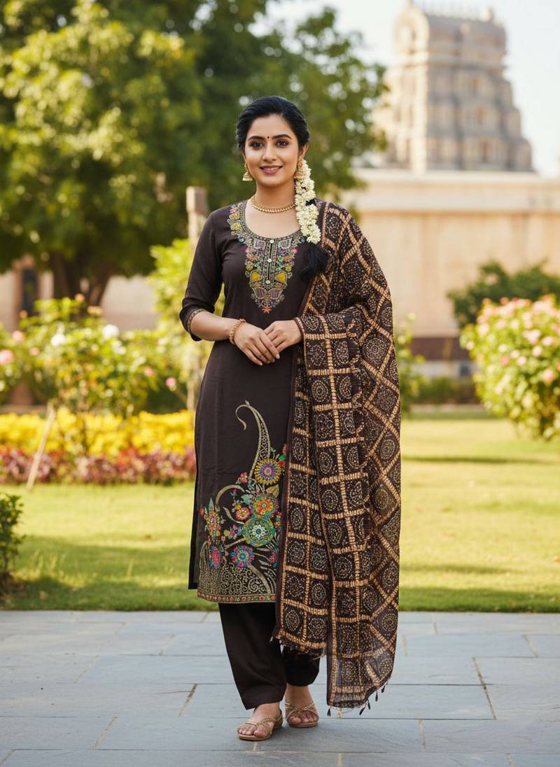 • Style : Salwar • Fabric : Santoon • Color : Coffee • Color : Coffee Dupatta Details