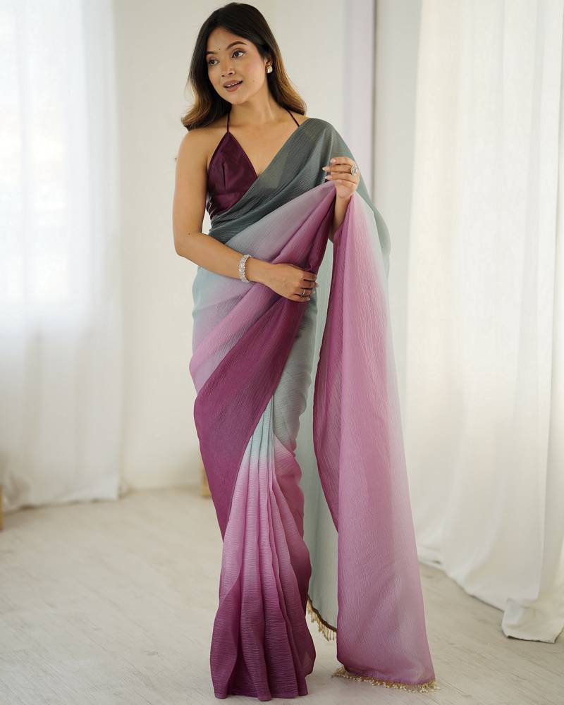 Designer Grey Wine Color Candy Crush Silk Fabric Stylish Pre Stitched Saree