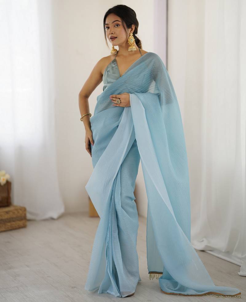 Designer Sky Blue Color Candy Crush Silk Fabric Stylish Pre Stitched Saree