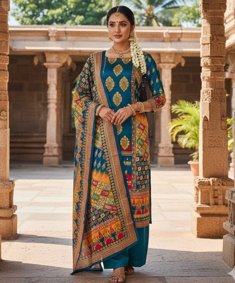 Firozi Chinon Printed Ethnic Ceremonial Suit Unstitched