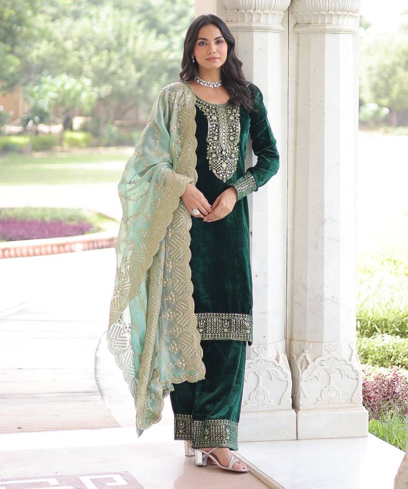 Attactive These Beautiful Looking Readymade Suit With Dupatta.These Top And Bottom Are Velvet And Dupatta is Fabricated On Fendy Silk.Its Beautified With Designer Jari,Sequance Embroidery Work.