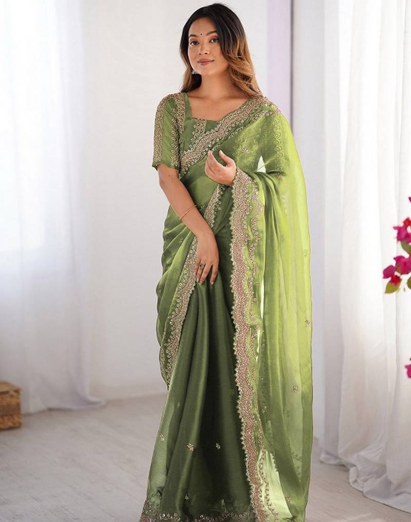 Green Color Burbery Silk Blend Blend Fabric Designer Embroidered Saree For Ceremonial Looks