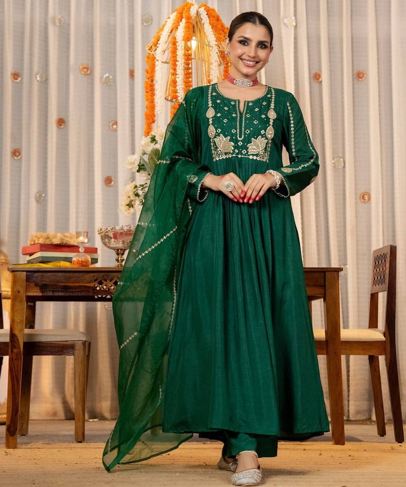 • Product Id : 4691920 • Package Details : 1 Kurta/1 Bottom/1 Batwa • Type : Kurta Sets • Occasion : Festive • Fabric : Chanderi • Work : Embroidered • Type : Sequins Work • Look : Designer • Sleeve : Half Sleeve • Neck Style : Round Neck • Color : Green • Stitching : Stitched • Length : 40.0 • Side Slit : Yes Payments [+]
