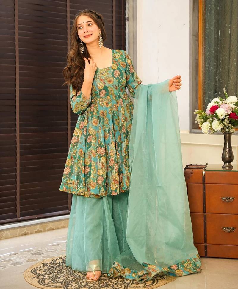Attractive Looking These Beautiful Looking Readymade Sharara Suits.These Top Are Silk And Bottom is Fabricated On Organza And Organza Dupatta.Its Beautified With Designer Digital Printed.