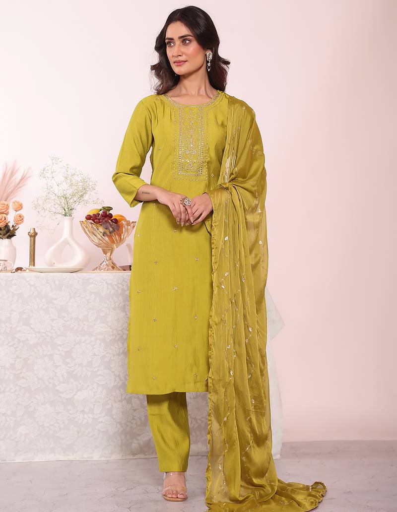 • Product Id : 4718160 • Package Details : 1 Kurta/1 Bottom/1 Dupatta • Type : Kurta Sets • Occasion : Festive • Fabric : Art Silk • Work : Embroidered • Type : Resham Embroidery • Look : Designer • Sleeve : Half Sleeve • Neck Style : Asymmetrical Neck Kameez • Color : Green • Stitching : Stitched • Length : 40.0 • Side Slit : Yes Payments [+]