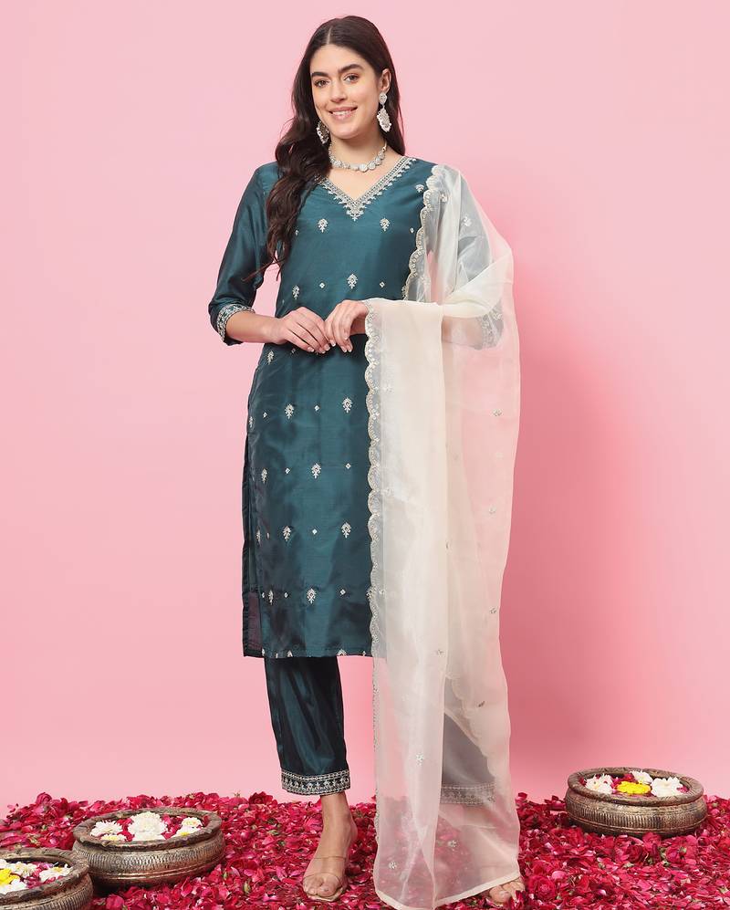 Green Color Silk Blended Ethnic Partywear Ceremonial Suit