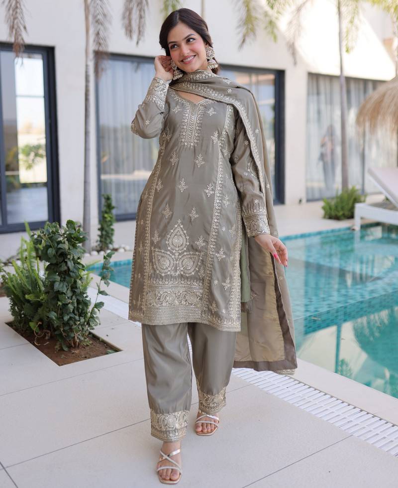 • Product Id : 4718012 • Package Details : 1 Kurta/1 Bottom/1 Dupatta • Type : Kurta Sets • Occasion : Ceremonial • Fabric : Art Silk • Work : Embroidered • Type : Resham Embroidery • Look : Designer • Sleeve : Full Sleeve • Neck Style : Asymmetrical Neck Kameez • Color : Grey • Stitching : Stitched • Length : 40.0 • Side Slit : Yes Payments [+]