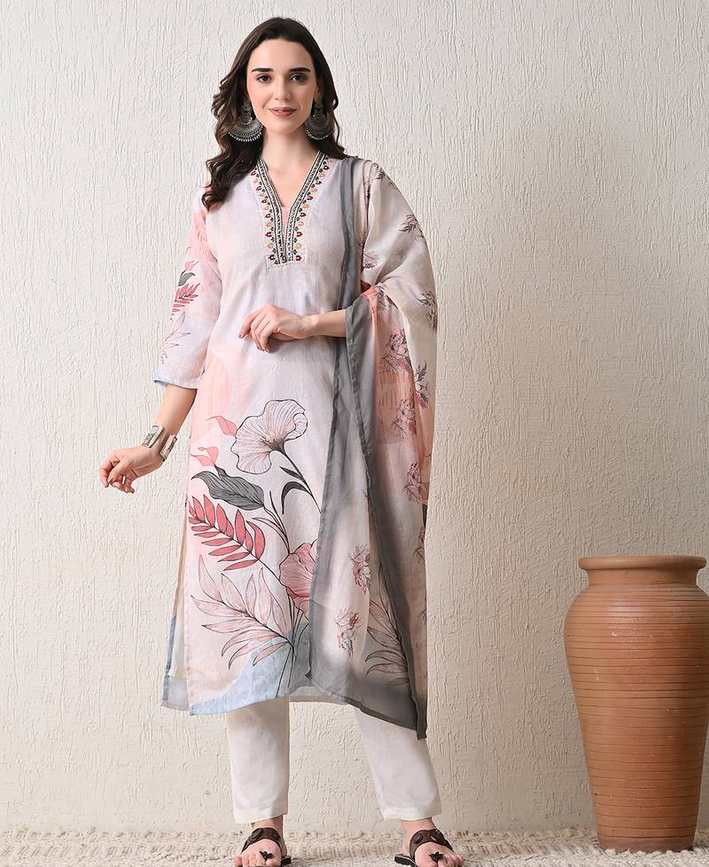 • Product Id : 4691841 • Package Details : 1 Kurta/1 Bottom/1 Dupatta • Type : Kurta Sets • Occasion : Festive • Work : Embroidered • Type : Resham Embroidery • Look : Designer • Sleeve : Half Sleeve • Neck Style : V Neck • Color : Grey • Fabric : Blended Cotton • Stitching : Stitched • Length : 40.0 • Side Slit : Yes Payments [+]
