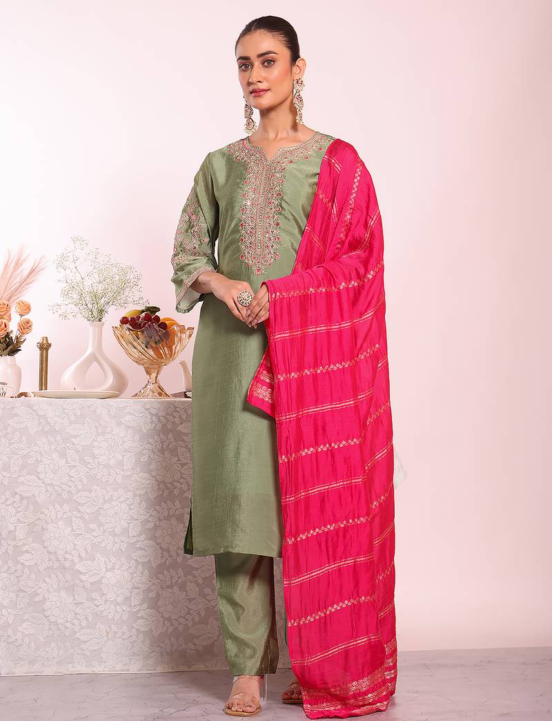 • Product Id : 4718161 • Package Details : 1 Kurta/1 Bottom/1 Dupatta • Type : Kurta Sets • Occasion : Festive • Fabric : Art Silk • Work : Embroidered • Type : Resham Embroidery • Look : Designer • Sleeve : Half Sleeve • Neck Style : Asymmetrical Neck Kameez • Color : Grey • Stitching : Stitched • Length : 40.0 • Side Slit : Yes Payments [+]