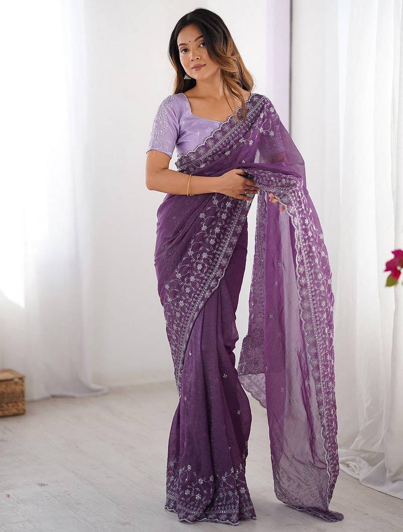 Lavender Color Crunchy Silk Blend Blend Fabric Embroidered Partywear Saree