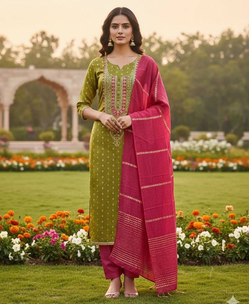 Mahendi Shimmer Jacquard Ethnic Readymade Suit Unstitched