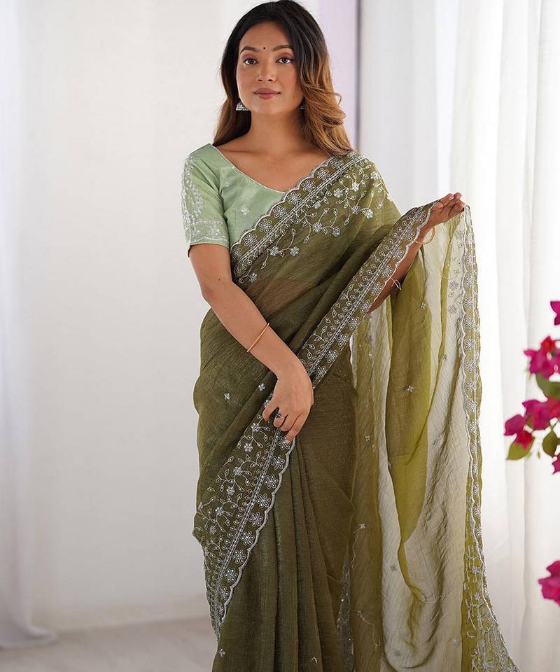 Mahendi Color Crunchy Silk Blend Blend Fabric Embroidered Partywear Saree