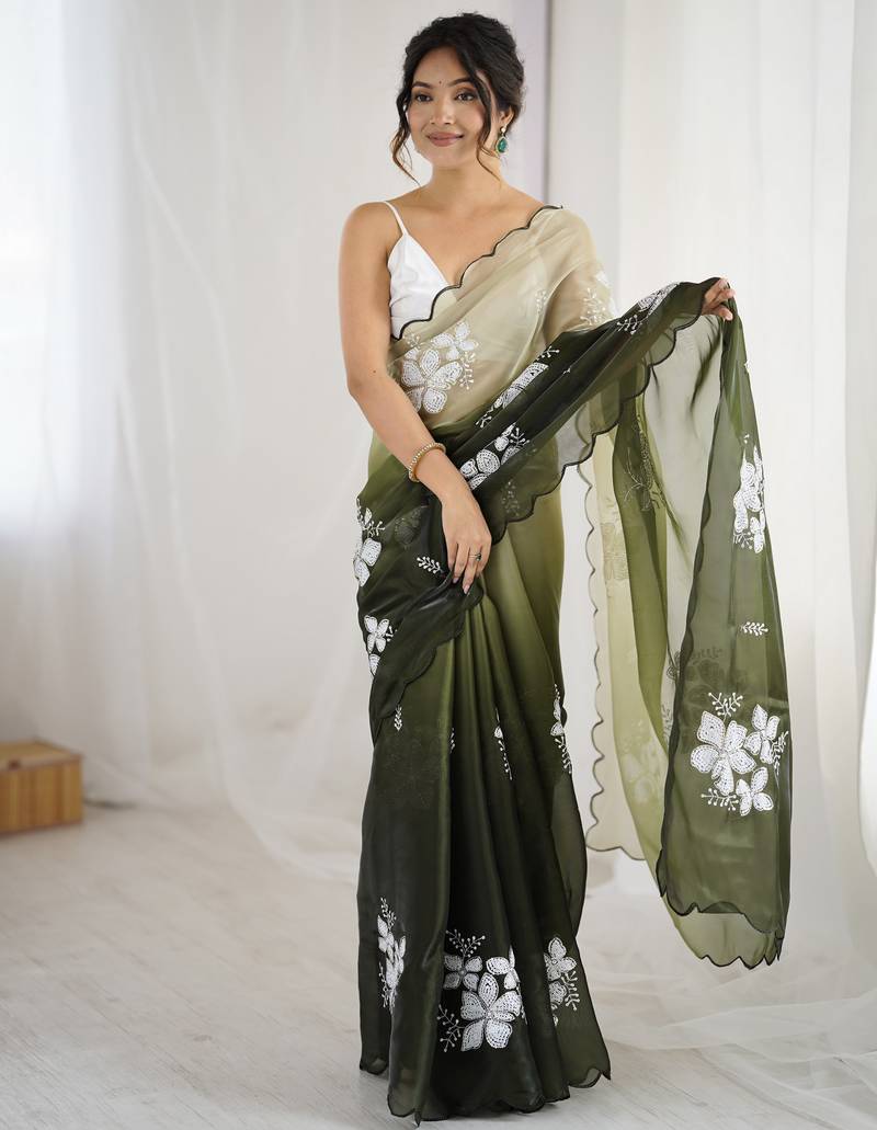 Mahendi Color Glamorous Jimmy Choo Fabric Beautiful Embroidered Saree