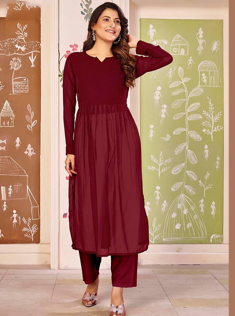 Maroon Color Beautiful Solid Printed Georgette Fabric Festive Long Kurta For Girls
