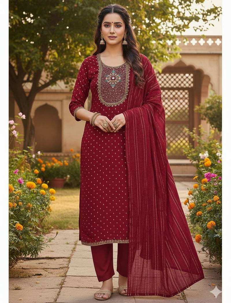 • Style : Salwar • Fabric : Santoon • Color : Maroon • Color : Maroon Dupatta Details