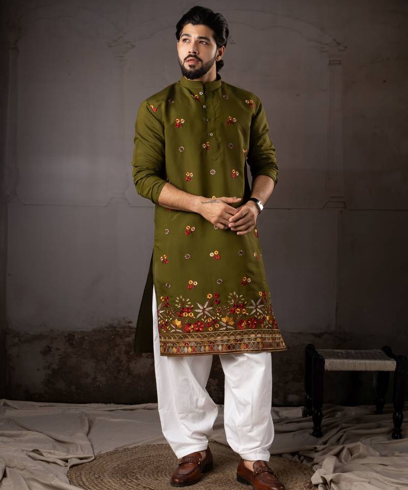 • Product Id : 4717294 • Package Details : 1 Kurta/1 Payjama • Type : Kurta Pajama • Occasion : Ceremonial • Fabric : Art Silk • Work : Embroidered • Type : Resham Embroidery • Look : Designer • Sleeve : Full Sleeve • Neck Style : Round Neck • Color : Green • Bottom Fabric : Art Silk • Bottom Color : Cream • Top Color : Green • Top Fabric : Art Silk • Bottom Style : Pyjama • Stitching : Stitched Payments [+]