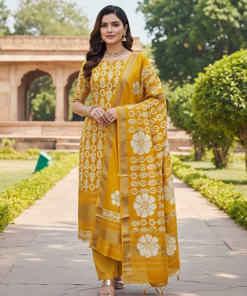 • Product Id : 4684602 • Package Details : 1 Top/1 Bottom/1 Dupatta • Type : Kurta Sets • Work : Woven • Type : Abstract Print • Look : Fashion • Sleeve : Half Sleeve • Neck Style : Round Neck • Stitching : Unstitched • Fabric : Art Silk • Color : Mustard Stitching [+]