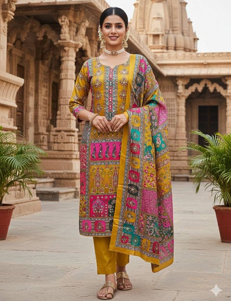Mustard Chinon Printed Ethnic Ceremonial Suit Unstitched