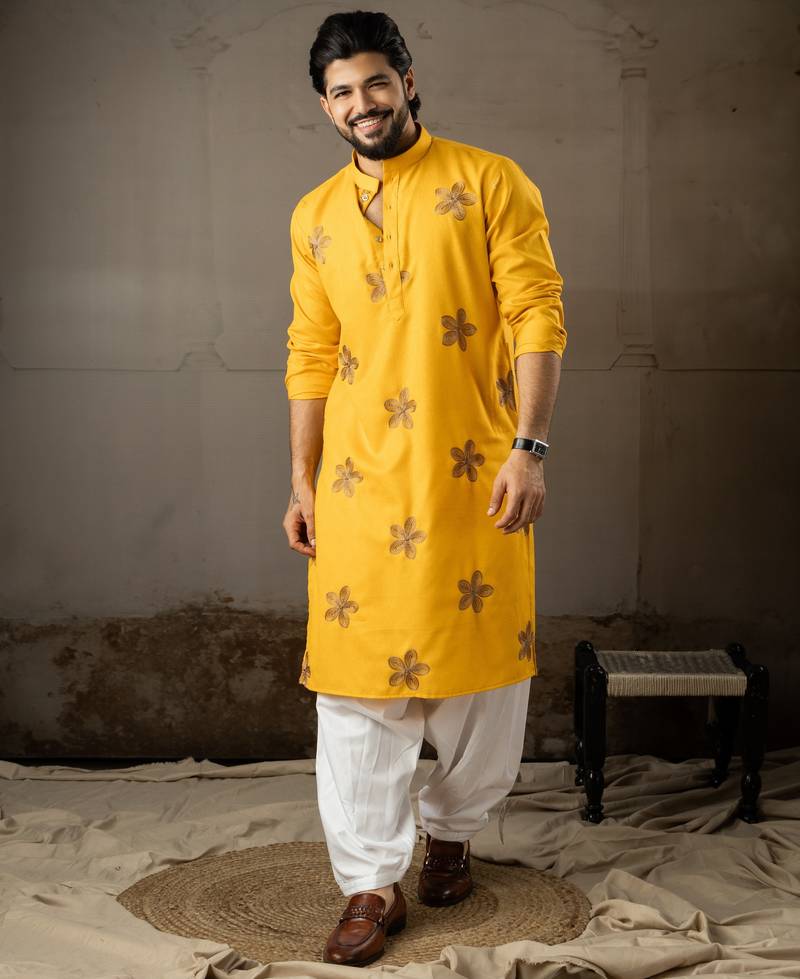 • Product Id : 4717309 • Package Details : 1 Kurta/1 Payjama • Type : Kurta Pajama • Occasion : Ceremonial • Fabric : Linen • Work : Embroidered • Type : Resham Embroidery • Look : Designer • Sleeve : Full Sleeve • Neck Style : Round Neck • Bottom Fabric : Art Silk • Bottom Color : Cream • Color : Mustard • Top Color : Yellow • Top Fabric : Linen • Bottom Style : Pyjama • Stitching : Stitched Payments [+]