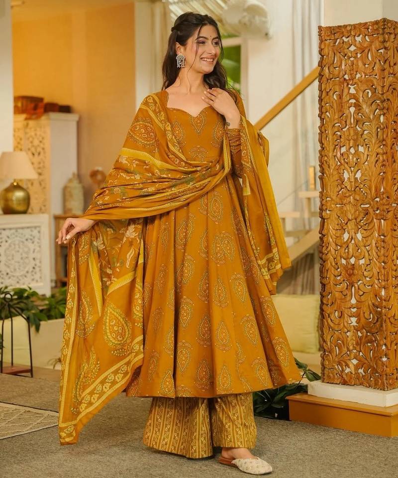 Mustard Color Muslin Fabric Designer Printed Readymade Ceremonial Palazzo Dress