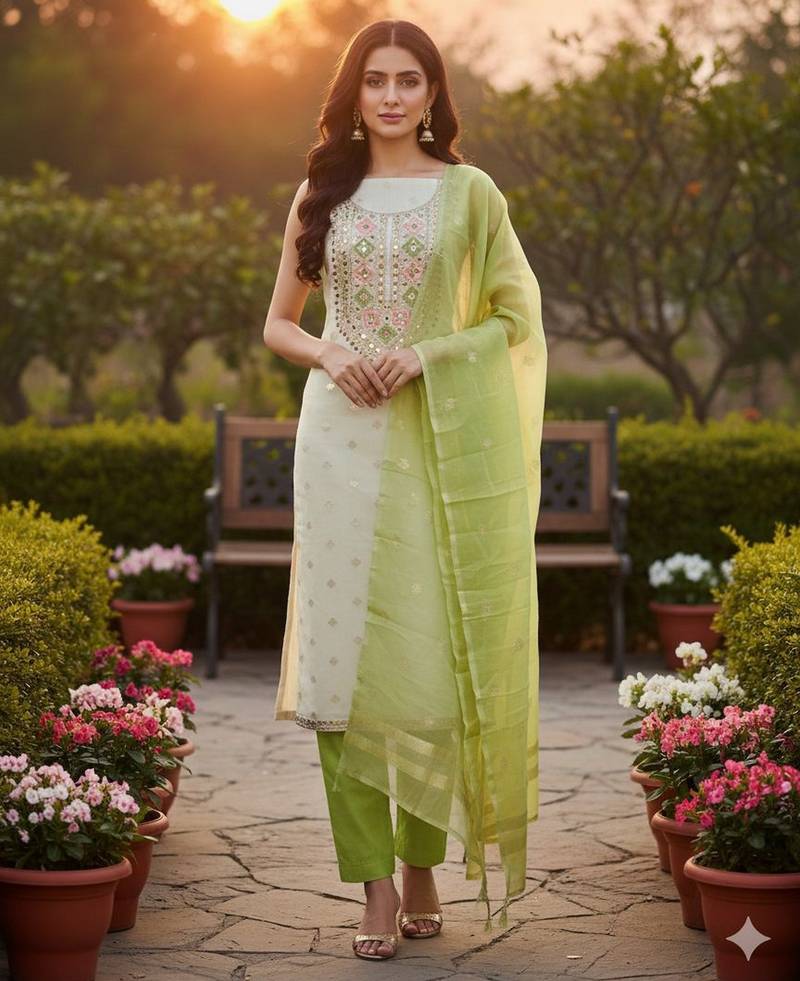 Off White Simmer Jacquard Embroidered Partywear Readymade Suit Unstitched