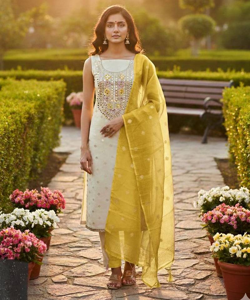 • Kameez : Color- Off White • Dupatta : Color- Mustard / Fabric- Chiffon • Bottom : Color- Mustard / Fabric- Santoon Kameez Details