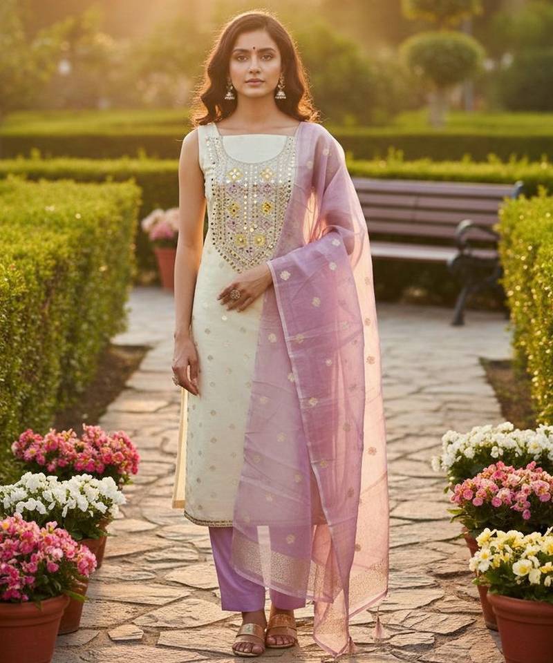 Off White Simmer Jacquard Embroidered Partywear Readymade Suit Unstitched