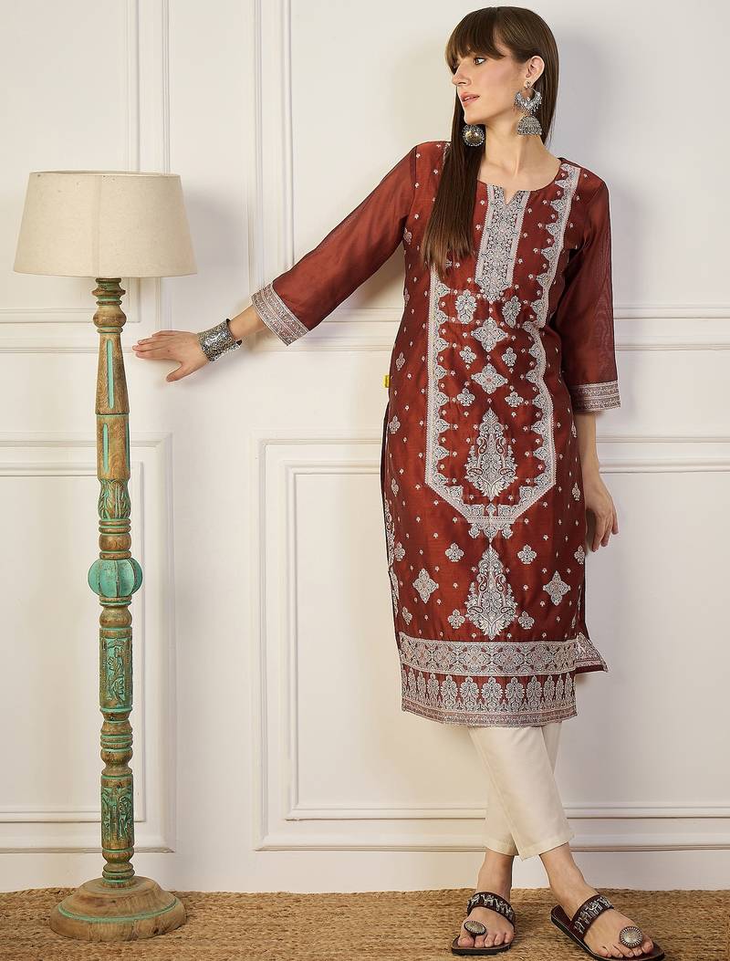Orange Color Cotton Silk Fabric Woven Designer Ethnic Formal Kurta