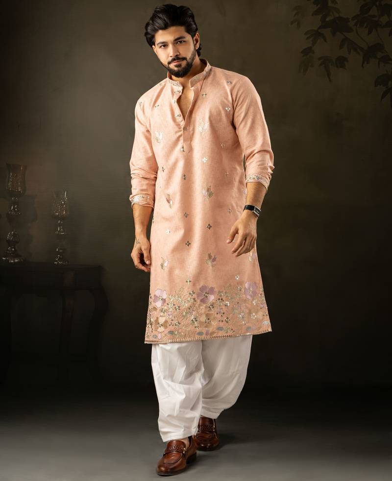 Peach Color Smart Embroidered Kurta For Rich Classy Men's Looks