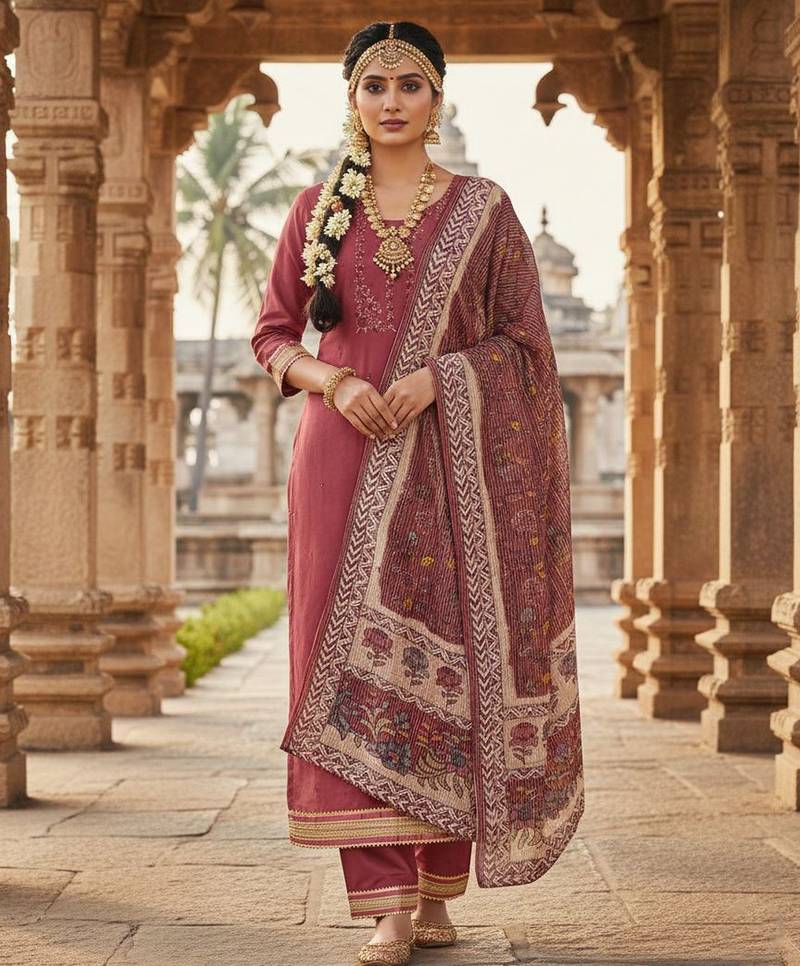• Product Id : 4717408 • Package Details : 1 Top/1 Bottom/1 Dupatta • Type : Kurta Sets • Work : Embroidered • Type : Resham Embroidery • Look : Designer • Sleeve : Half Sleeve • Neck Style : Round Neck • Stitching : Unstitched • Fabric : Art Silk • Color : Pink Stitching [+]