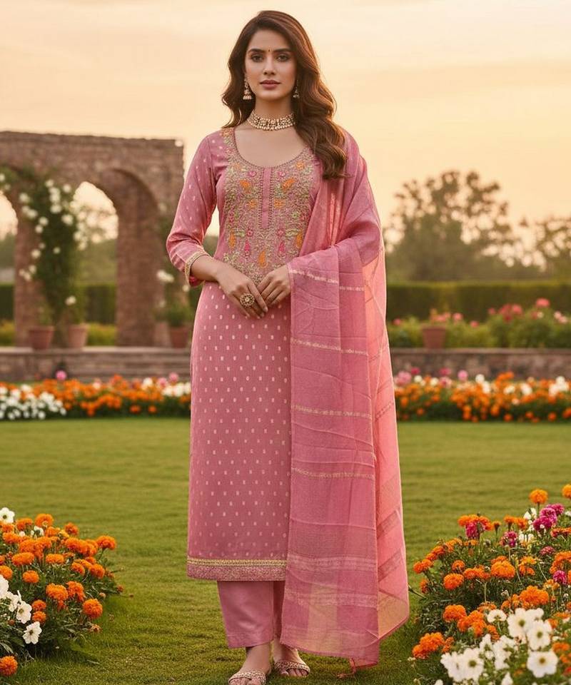 • Product Id : 4684593 • Package Details : 1 Top/1 Bottom/1 Dupatta • Type : Kurta Sets • Work : Woven • Type : Resham Embroidery • Look : Fashion • Sleeve : Half Sleeve • Neck Style : Round Neck • Stitching : Unstitched • Fabric : Jacquard • Color : Pink Stitching [+]