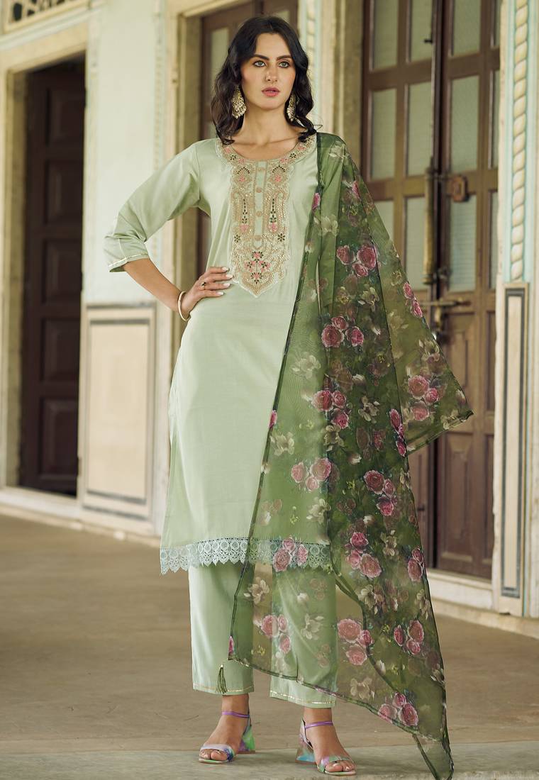 Pista Color Viscose Rayon Fabric Beautiful Embroidered Kurta Set With Dupatta