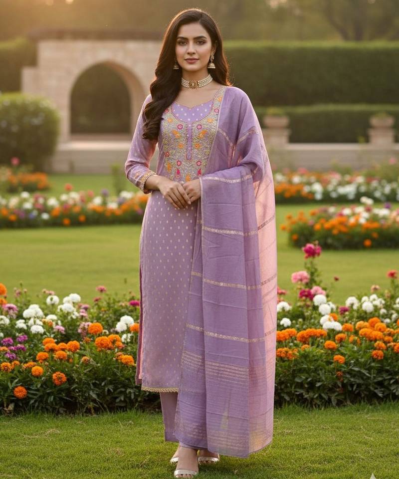 • Product Id : 4684592 • Package Details : 1 Top/1 Bottom/1 Dupatta • Type : Kurta Sets • Work : Woven • Type : Resham Embroidery • Look : Fashion • Sleeve : Half Sleeve • Neck Style : Round Neck • Stitching : Unstitched • Fabric : Jacquard • Color : Purple Stitching [+]